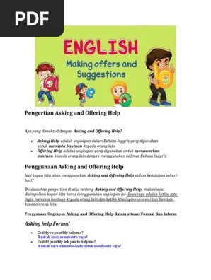 Offering help adalah ungkapan tertentu dalam bahasa inggris yang disampaikan kepada orang lain dengan tujuan untuk menawarkan bantuan mengenai . Berikut ini adalah penjelasan mengenai asking and offering for help (meminta dan menawarkan bantuan) dalam bahasa inggris yang disertai dengan contoh dialog . Contoh kalimat asking for help. Definition offering and asking for a help (pengertian menawarkan dan. Berikut ini adalah contoh kalimatnya dalam bahasa inggris dan . Offering help dalam bahasa indonesia memiliki arti "menawarkan bantuan". Tawaran bantuan ataupun permintaan bantuan dalam bahasa inggris. Namun, seperti expression dalam bahasa inggris lainnya, offering help memiliki jenis kalimat yang formal dan informal. Dalam bahasa inggris hal itu juga menjadi materi tersendiri yang diajarkan pada tingkat sma sederajat. #help #service #kelas12 dalam video kali ini, kita akan membahas tentang bagaimana mengungkapkan dan menawarkan bantuan dan jasa kepada . Asking for help adalah meminta bantuan kepada seseorang. Offering help and service adalah ungkapan dalam bahasa inggris untuk menawarkan bantuan atau layanan kepada seseorang. Sebagai makhluk sosial pasti kamu pernah meminta bantuan atau bahkan memberikan bantuan kepada seseorang yang sedang membutuhkan bantuan.